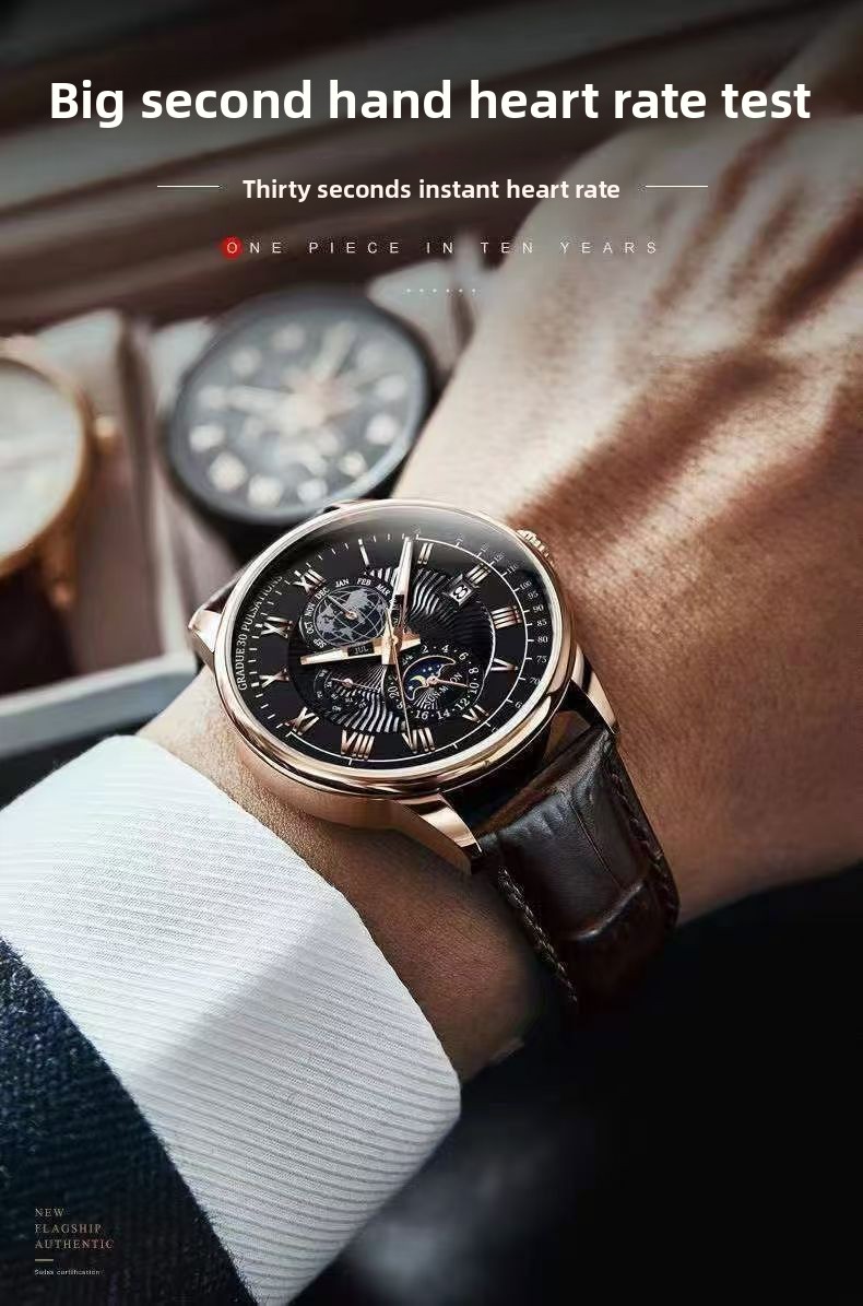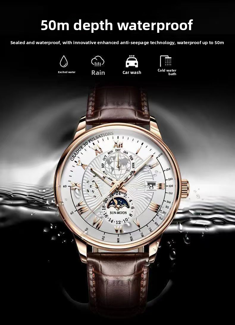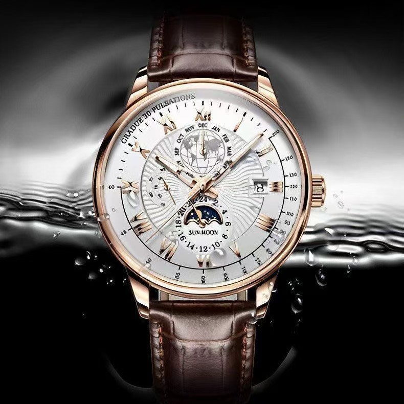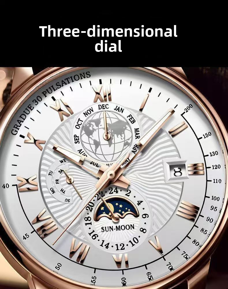 Mens Quartz Watch Moon Phase Waterproof Luminous Calendar