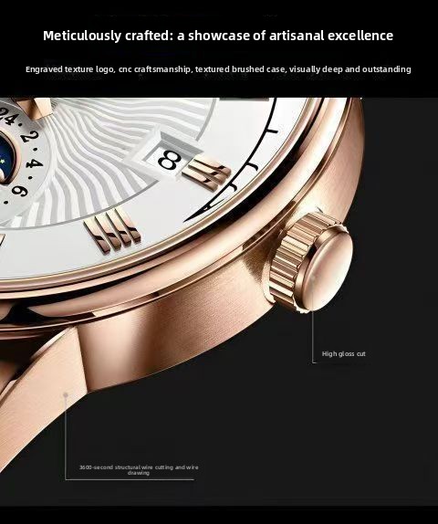 Moon Phase Display: Features an elegant moon phase complication for sophisticated timekeeping.